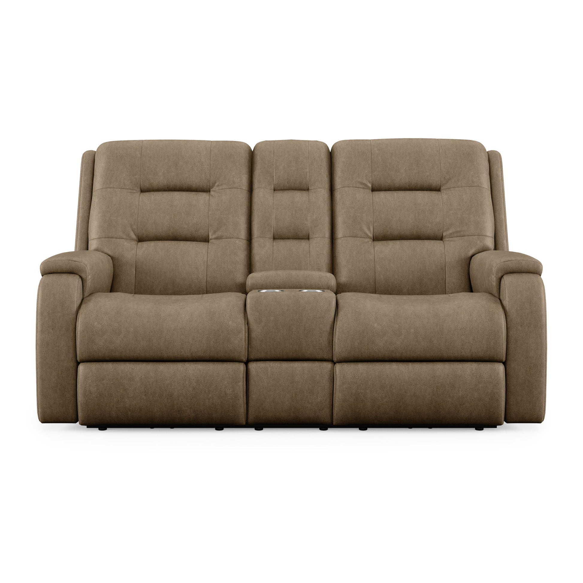 Picture yourself in comfort and style. Arlo is a transitional motion style that features a refined, rounded pad-over track arm that is lined with blind seams. It's pull-tufted back cushions create a unique subtle pattern and added pockets of comfort. This reclining loveseat's proven comfort combination is created from the generously scaled triple-divide back, contour seating, and chaise pad design. The Blue Steel Spring ensures this piece is in it for the long-haul. The smooth release handle lets you change angles effortlessly from an upright to a fully reclined position. Arlo will bring plush comfort and tailored elegance to your room.