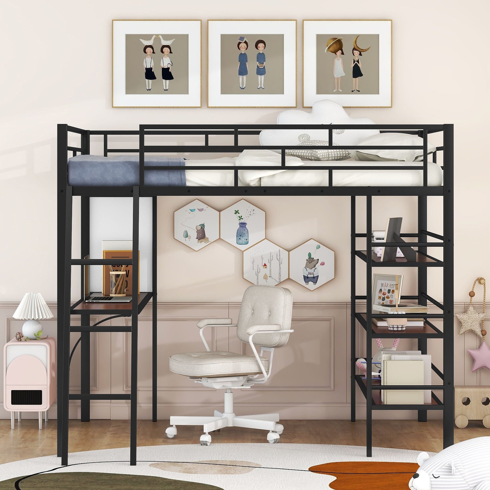 Maximized Space: The loft bed includes three open shelves, perfect for storing books, lamps, toys, and more. Conveniently placed beside the desk, these shelves provide easy access to your essentials.