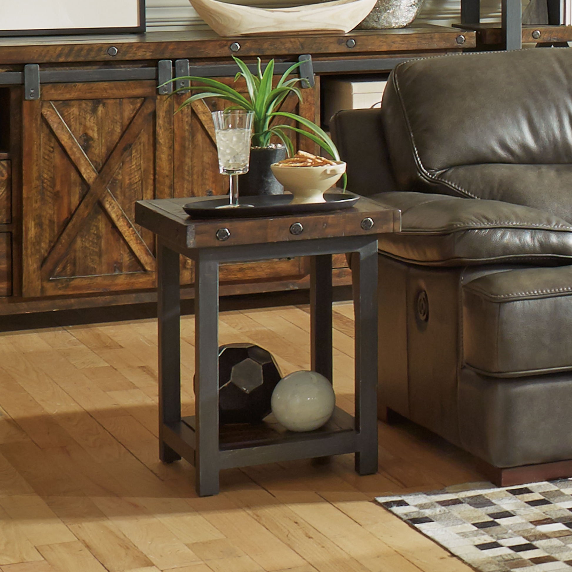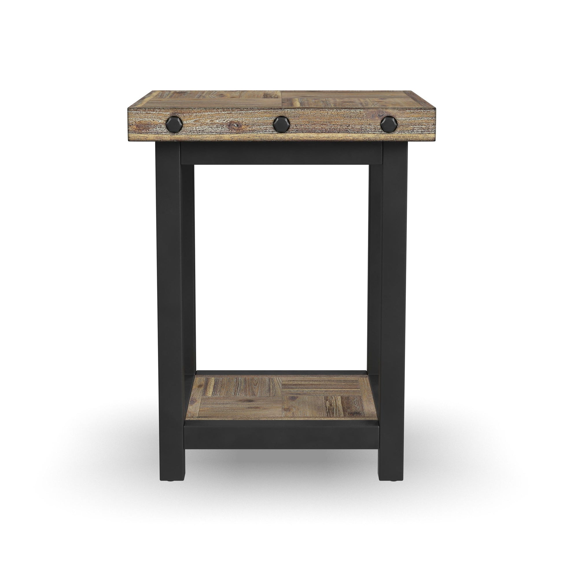 Instantly add inviting character to living spaces with the Carpenter chairside table. Sized perfectly for smaller spaces, this table still has plenty of room to hold your favorite book and cup of coffee. An open lower shelf offers an additional area for storage or to display décor. Inspired by the look of vintage workbenches, this chairside table features distressed acacia wood planks for a reclaimed look, hand-worked metal frames and exposed bolt heads.