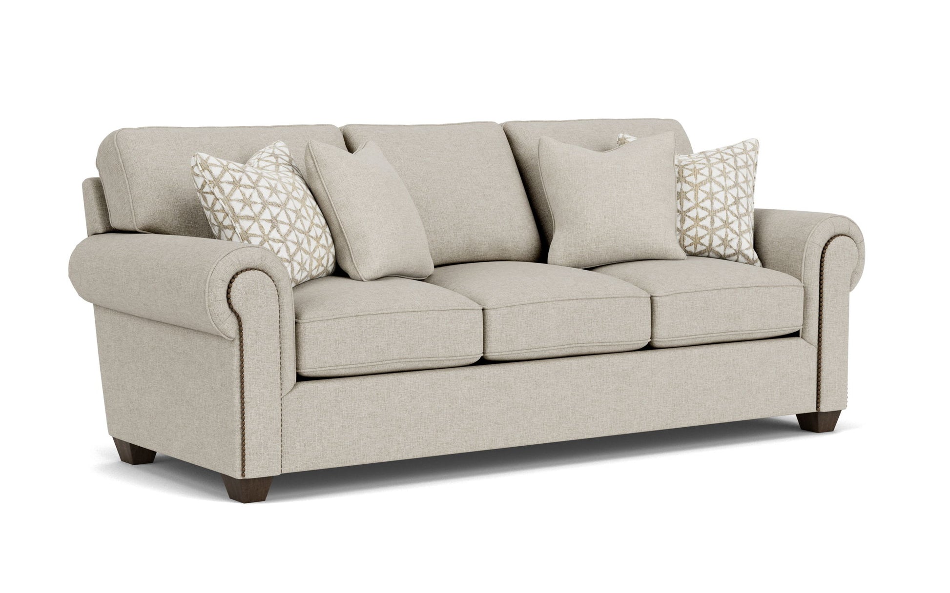 Dramatic characteristics on a bold frame. A unique wrap-around padded armrest on Carsons large-scale rolled arm is highlighted with pleats and welt cording. Optional nailhead trim tightly spaced lines the exposed arm fronts for a fun, visual effect. Relax into Carsons overstuffed seat and back cushions after a long day and feel the stress melt away.
