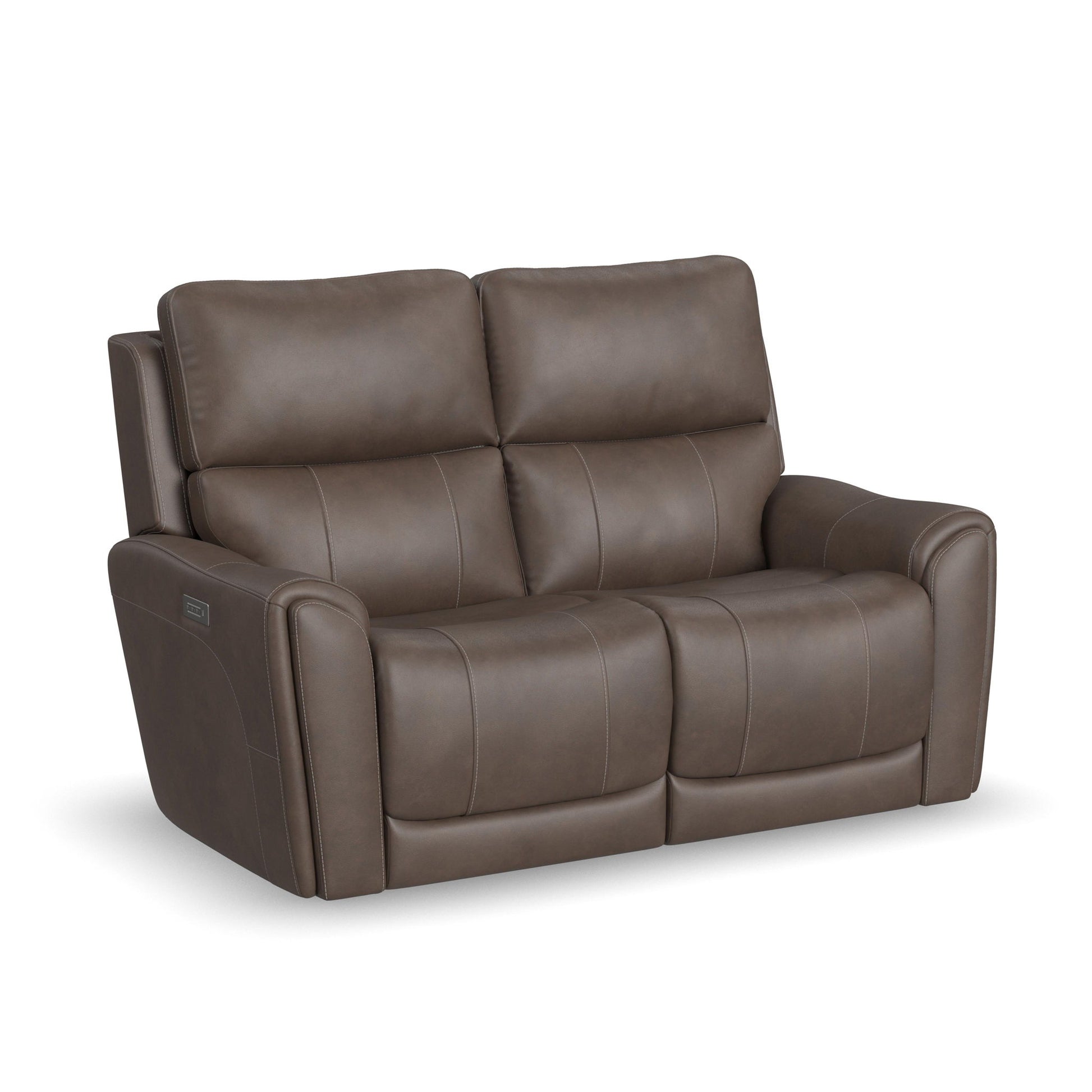 Power up and enjoy secretive perks with the Carter power reclining loveseat. Customize your comfort with adjustable recline, headrest and lumbar support on both seats, including reclining to a Zero Gravity position for a weightless experience, reducing pressure on joints. This loveseat will be a statement in your home with its genuine leather look that is a durable, easy to clean fabric in a cappuccino brown color, and Flexsteel's patented Blue Steel Springâ„¢ at the heart of each seat for ultimate durability. Flared arms, a contoured seats and heavy thread stitching details give it a sleek, yet striking look. And it all comes with pop-out cupholders in the arms for discreet storage.