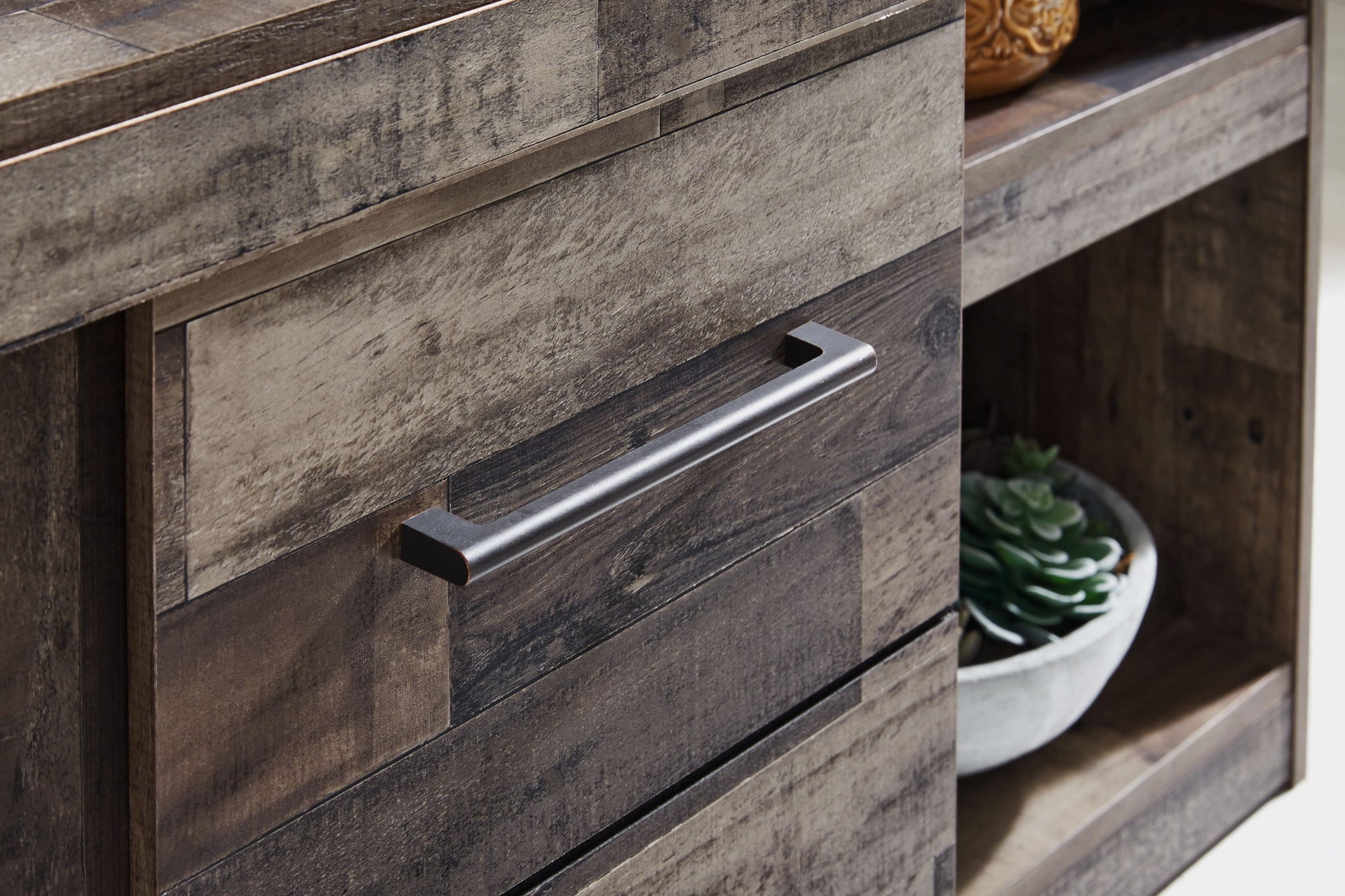 Make this entertainment center the center of attention with its popular urban eclectic style. Its rustic finish over a replicated pine grain creates an authentic natural look for your home entertainment area. You'll love its functionality. Two tall piers with open shelving allow you to put home accents on display, safely out of the way, while the TV stand’s two spacious cabinets with shelved storage easily accommodate media needs.