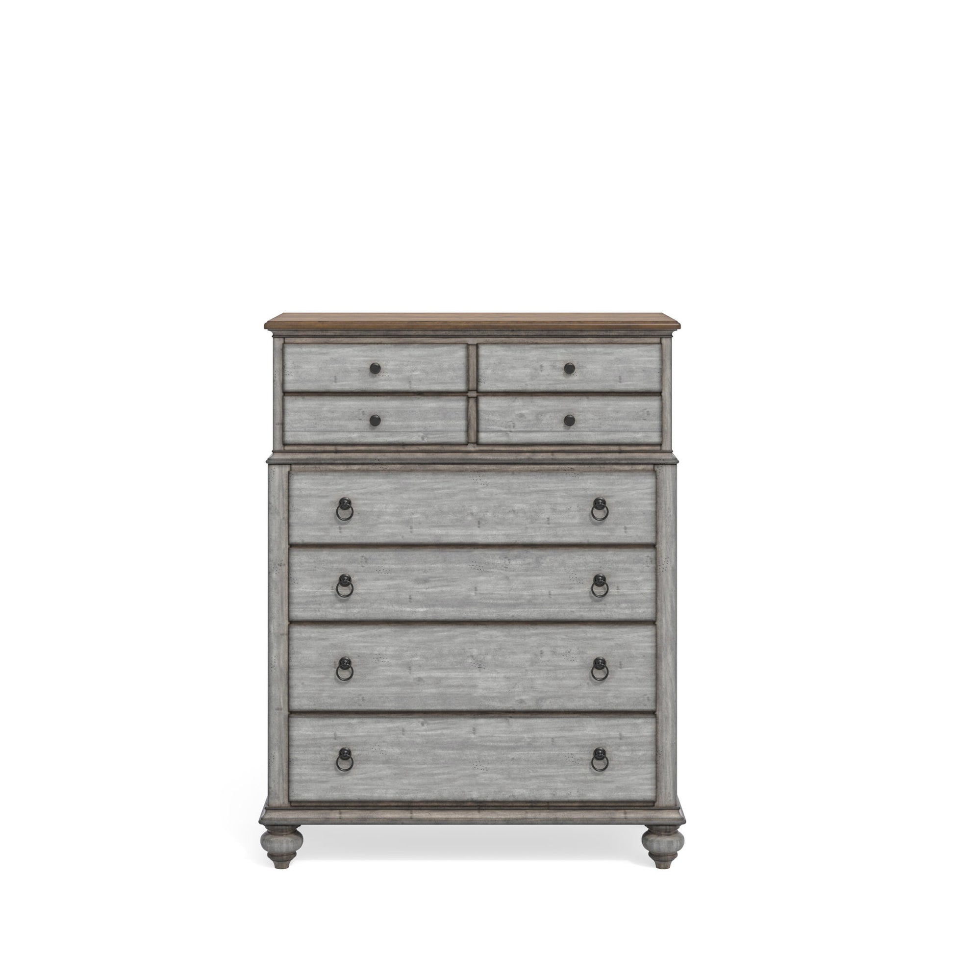 Store clothing and accessories in cozy cottage style with the Plymouth drawer chest, designed to perfectly complement our various Plymouth bed options. Attractive and practical, this drawer chest features eight drawers on premium ball-bearing glides, with two felt-lined top drawers and a cedar-lined bottom drawer to protect contents. A weathered graywash finish highlighted by a contrasting medium brown top, paneled accents and turned bun feet complete the charming vintage look.