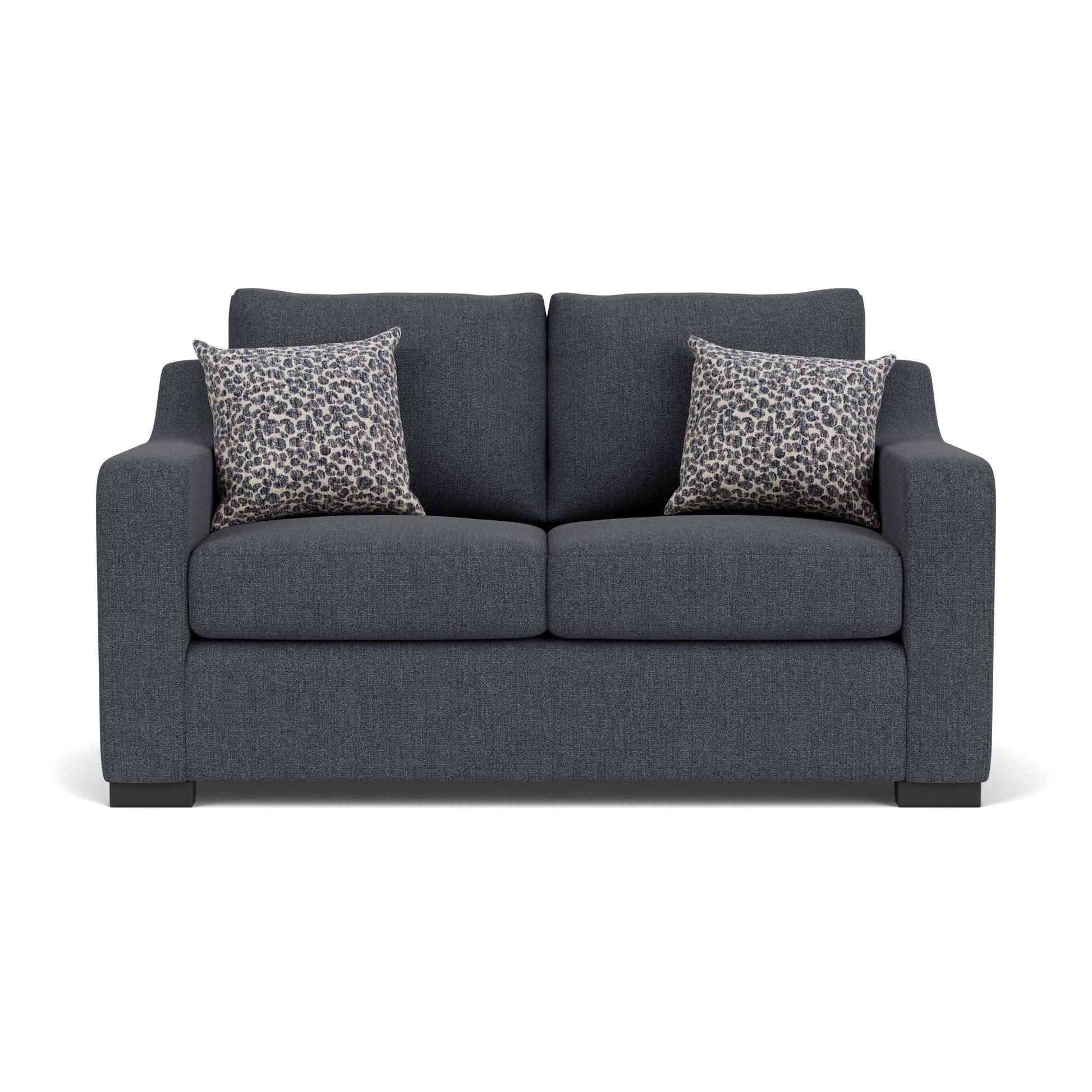Harmonious Flair. Cozy and casual yet stylishly relevant, the Quinn loveseat exudes an effortless vibe that harmonizes with any decor. Gently sloping track arms sit atop black recessed legs to make a statement. Two accent pillows add flair, while plush, sink-in cushions ensure that comfort never gets compromised. Create the perfect, relaxed look for your living space with your choice of upholstery fabrics, including performance and sustainable options.